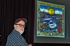 His work, distributed through his web store in Ketchikan, Alaska, can be found on posters, hoodies, and millions of t-shirts sported by fisher folks, the occasional celebrity and many others. Ray’s paintings and mixed-media drawings are in the collections of the Miami Museum of Science, the Burke Museum of Natural History and Culture, Alaska Airlines, the Anchorage Museum, the Alaska State Museum, and the Ketchikan Museum. His books include Sharkabet: a Sea of Sharks from A to Z and Crusisn’ the Fossil Coastline and Cruisin the Fossil Freeway with Dr. Kirk Johnson, now director of the Smithsonian National Museum of Natural History, for which he and Kirk were awarded a Guggenheim Fellowship. He has illustrated and authored more than a dozen popular books including Shocking Fish Tales, Planet Ocean, Raptors, Fossil, Fins and Fangs and Rapture of the Deep. His latest is a career overview called Spawn Till You Die, the Fin Art of Ray Troll published by Clover Press Books.